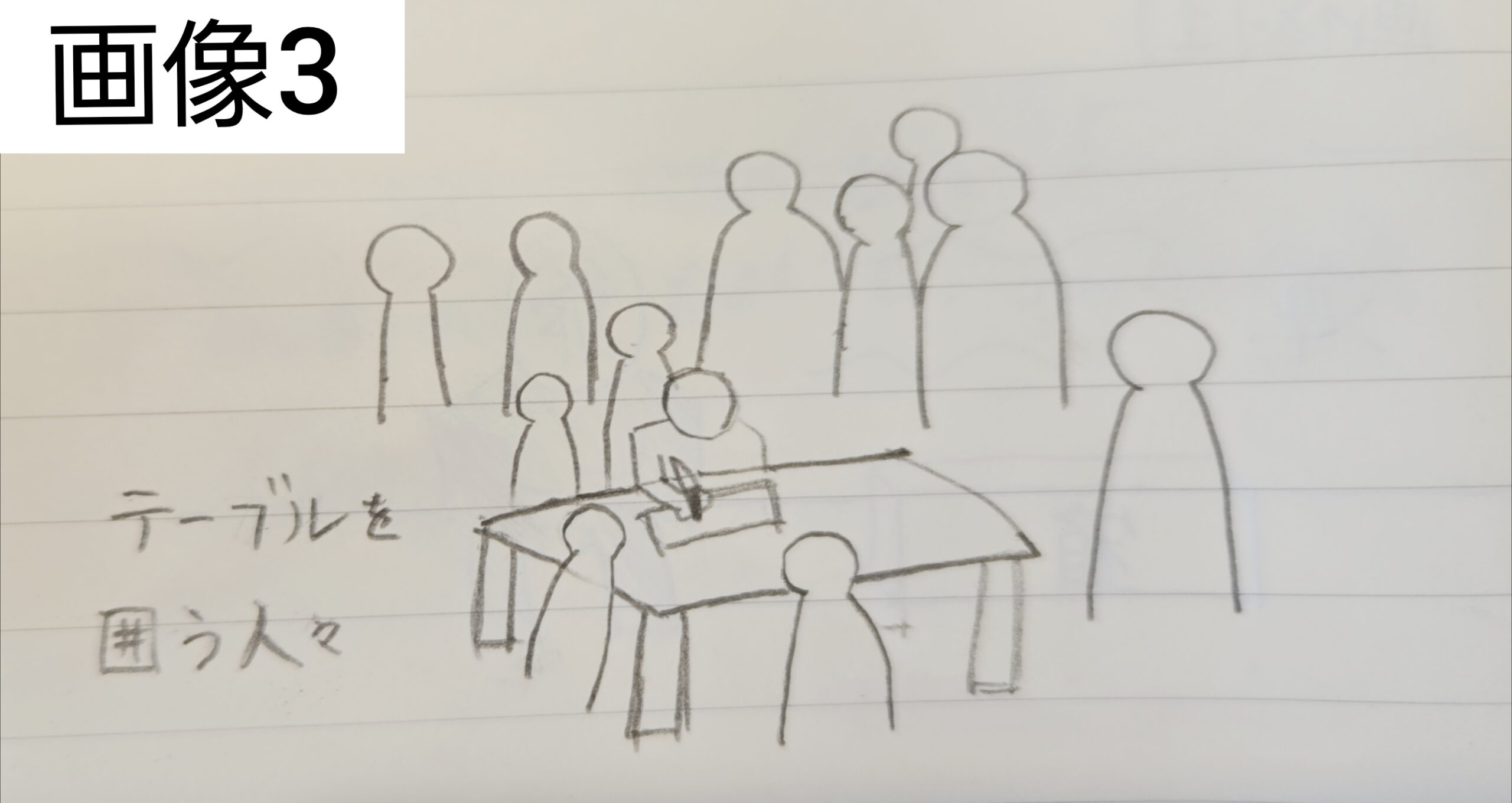 テーブルを囲んで手紙を書く人々が見受けられる。
