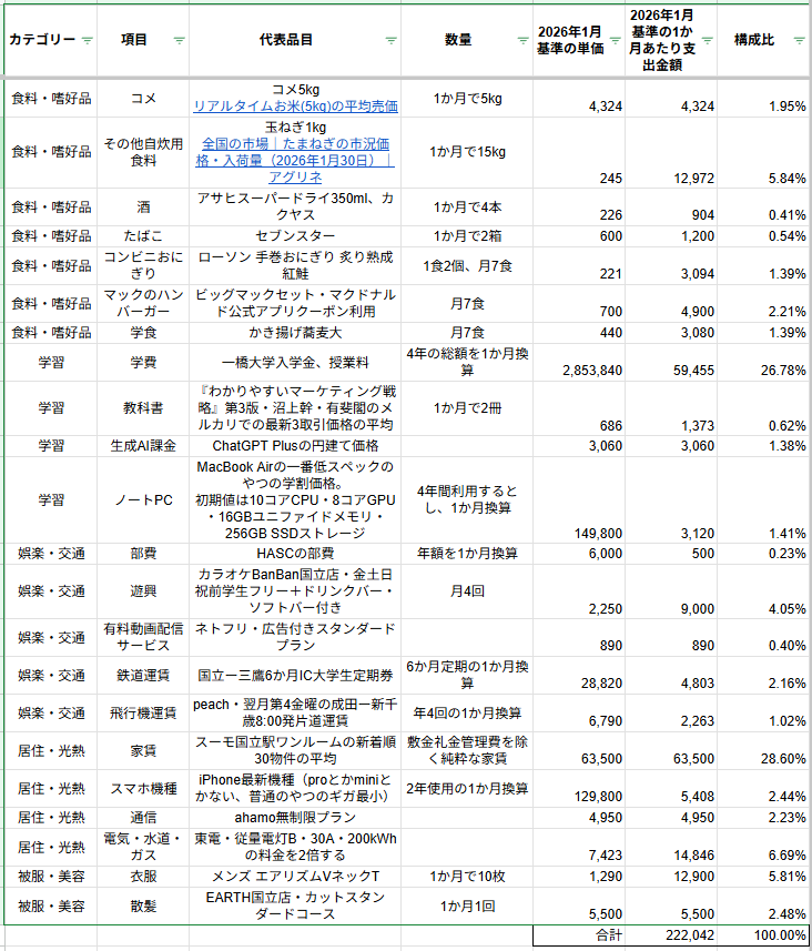 同会チーフエコノミストの無内亭円楽氏によると、HUSPIは「食料・嗜好品」や「学習」など5つのカテゴリーに分かれており、「コメ」や「家賃」などの支出の大部分を占める典型的な項目のほか、学生に特有の「学費」や「生成AI課金」を含む22の項目で構成される(図1参照)。